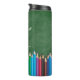 A modern personalised tumbler for teachers featuring a green chalkboard background with colourful coloured pencils. Teacher's Name in Script. Custom text at bottom in a serif font.