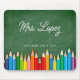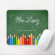 A modern personalised mouse pad for teachers featuring a green chalkboard background with colourful coloured pencils. Teacher's Name in Script. Custom text at bottom in a serif font.