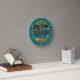 Modern teal and gold brush paint strokes with border Round Clock. It showcases modern brush strokes in gold foil and teal blue and a teal border with gold numbers.