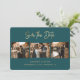 Elegant personalised teal and gold wedding photo save the date cards with a modern faux gold foil script title. Easily personalise this dark teal save the date with your images and wedding details including a wedding website.