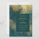 This modern wedding invitation features a moody teal and gold abstract watercolor background. Customise the gold-coloured text in stylish fonts on a teal blue rectangle. The back of the card repeats the abstract design.