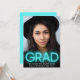 Fun, trendy graduation announcement with "GRAD" in bright light teal blue neon typography overlaying the graduate's photo. Personalise with his or her name, class year and school.