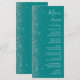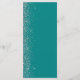 The left-hand edge of this elegant modern wedding menu features a silver faux glitter design. The customisable text combines silver grey handwriting, copperplate and italic fonts on a teal blue background. The reverse side features a matching teal and silver glitter design.