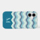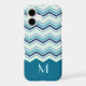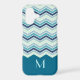 This case features a pretty chevron stripe pattern in colours of blue, turquoise, teal, and grey. The bottom third of the case is solid matching teal blue, making a nice contrast to the chevrons. Your monogram is in matching light turquoise blue on the solid portion. Unique and attractive with your own personalised touch!