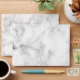 The inside of this elegant modern wedding invitation envelope features a teal blue watercolor agate design trimmed with faux gold glitter. Customise the back flap with the names of the bride and groom in gold-coloured handwriting script and return address in black copperplate font on a grey and white marble background.