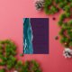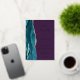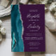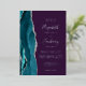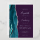 The left-hand edge of this elegant modern wedding invitation features a teal blue watercolor agate border trimmed with faux silver glitter. The customizable text combines real silver foil handwriting, copperplate and italic fonts on an opulent deep purple background. The reverse side features a matching teal and silver agate design.
