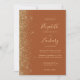 The left-hand edge of this elegant modern wedding invitation features a gold faux glitter design. The customisable text combines pale gold-coloured handwriting, copperplate and italic fonts on a terracotta background. The reverse side features a matching terracotta and gold glitter design.