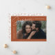 Share the news of your surprise engagement with these elegant photo engagement announcements. The design features the phrase "Surprise, we got engaged!" in a trendy white script and modern lettering on a terracotta background. Your engagement photo is featured in the centre-right part of the design with your names and engagement date displayed on the left. Personalise the surprise engagement announcement by adding additional details below such as wedding city/state, wedding website, etc. The announcement reverses to display a terracotta foliage pattern on a white background.