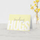 A simple modern card packed with kindness and affection, this design has "sending hugs" text in a combination of bold and handwritten script on the front of the card. The light lemon yellow background is a popular colour choice and adds to the contemporary look of the card. Inside text is a thoughtful expression that can be ordered as written or personalised with your own desired inside text. This card is not only a great choice for special occasions like Valentine's Day, it is also a perfect choice for sending a thoughtful card to someone who is ill, needs a pick-me-up, or perhaps a family member or friend who is living alone or in a nursing home. So many possibilities to brighten someone's day with this simple card.