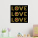 Modern three rows of the word"LOVE" and red hearts gold foil on black print.