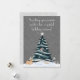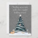 This card features a modern tree, in shades of blue and grey, surrounded by a variety of small woodland, forest friends; deer, fox, bunnies and birds. This design is set against a medium grey backdrop, with the appearance of tiny snow flurries. Text is in light grey, which may be changed by the customer.