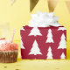 Modern Christmas pattern features white geometric trees in varying sizes on a burgundy background. Perfect for holiday wrapping.