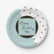 A beautifully stylish look for a feminine themed birthday party, this contemporary design features scattered confetti polka dots in black over a white background on one half of the design with a solid dusty light blue colour block on the opposite half. A golden double frame with matching blue background surrounds the centre text in beautiful style. Lovely handwritten script type face spells out "Happy Birthday" in large lettering to add emphasis to the happy occasion. Personalise the name with the birthday guest of honour's name. Note: These paper plates are available in 2 sizes. Shown here in the 7" size which is a good choice for serving birthday cake and small items, the larger 9" size is a better choice for serving more substantial party treats. Be sure to select the size that best suits your needs.