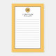 A modern trendy lined notepad with a minimalist design with a stylised monogram medallion. Custom name or custom text presented on a simple white background, framed by a bright mustard yellow border. Personalise using the fields provided or use the 'message' button to contact the designer for help.