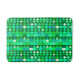 Bath mat patterned in bands of geometric shapes, in a modern take on a tribal pattern, in shades of seafoam green, jade green, aqua, and turquoise on a deep emerald green background