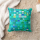 Square pillow patterned in bands of geometric shapes, in a modern take on a tribal pattern, in sea glass colours of aqua, turquoise, bottle green, cobalt blue, and quartz white