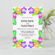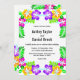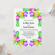 This elegant tropical wedding invitation is perfect for a modern summer wedding. The simple design features bloom yellow, purple, and pink flowers with elegant black typography on a white background.