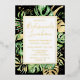 This sophisticated tropical bridesmaids luncheon invitation features green and gold palm, philodendron, and fern leaves on a black background. An elegant gold foil frame highlights the gold foil text. Gold foil splatters accentuate this exotic botanical design and brings a bit of modern whimsy to the invitation. This island oasis invite is perfect for any luau, beach or tropical themed bridesmaids luncheon.