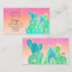 A modern yoga instructor business card with exotic and tropical cacti pattern with hand drawn and hand painted green, blue, turquoise cactus and succulents on a bright and colourful pink and coral watercolor ombre background. A summer design
