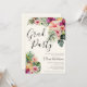 A modern tropical graduation party invitation template for a summer themed party. This trendy invite features watercolor hibiscus flowers, plumeria florals, palm leaves, and a pineapple.