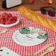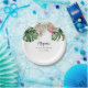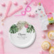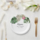 Modern tropical theme baby shower paper plate featuring watercolor illustration of monstera leaves, palm leaf, and pink king protea flower. Great for your summer party.