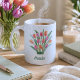 Bring the beauty of spring into your everyday life with our enchanting watercolor potted tulips personalised coffee mug! Featuring a stunning graphic design of tulips in a charming pot, this mug is perfect for nature enthusiasts and anyone who appreciates delicate floral art. Add a touch of elegance and colour to your morning beverage routine with this lovely mug.