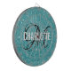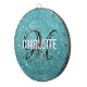Modern turquoise glitter dart board with a white typography name and black monogram. Personalise with name and initial.