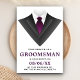 Invite your groomsmen with this modern request card featuring a classic tuxedo with a purple tie against a white background. Simply add your event details on this easy-to-use template to make it a one-of-a-kind invitation. Flip the card over to reveal a black and white stripes pattern on the back of the card.