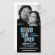 A save the date photo card for the couple that is not afraid of being different. Bold sans serif type in light blue and shades of grey stand out against the rich black background on this clean but effective card. Add your own information and photo. Available in alternate colours with matching products.