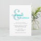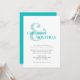 This simple wedding invitation offers a bold typography design featuring the names of the bride and groom accented with a large ampersand sign. The names of the bride and groom, the ampersand and the backside appear in a bright aqua colour.