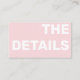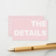 This modern enclosure card features large, bold fun lettering for "THE DETAILS" in bright pink with easy to read white typography, creating a vibrant and minimalistic look. Perfect for weddings or parties, it offers space to add essential venue, RSVP, and reception information in a simple style guests will find clear and accessible. Customise the message to suit any celebration, making this card a stylish and practical addition to your event stationery.