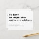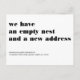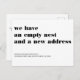 Moving announcement postcard with modern minimalist typography design in black and white. All of the wording is fully editable to suit both couples or singles. The editable title on the front reads "we have an empty nest and a new address" in bold, oversized typography and you can add your new address and personalised messages to the front and back.