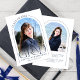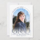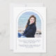 This navy blue and white simple minimalist arch graduation announcement features a delicate arch frame, 2 photo templates and elegant modern typography.