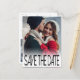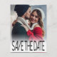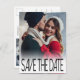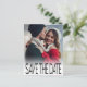 Bold and modern typography creates a trendy Save the Date card that is sure to be noticed. Features two photos of the engaged couple. A large vertical photo on the front and a smaller horizontal photo on the back.