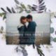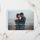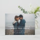 Modern Typography Photo Save the Date Announcement with a clean and modern line text box design in white. Add a photo and your wedding details to customise. Background colour on back side of invite may be changed to complement the photo or to add your wedding colour.