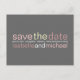 A graphically styled 'save the date' postcard announcement that features a trendy colour scheme and bold typography. Let friends and family know that you've set the date with a contemporary design that's simple but unique. Available in a variety of colour combinations; this one in two shades of pink with hints of yellow and white on a soft dove grey background.