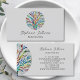 This modern and unique reiki master business card is decorated with a colourful mosaic tree of life design and stylish script typography on a grey background.
