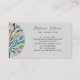 This modern and unique yoga instructor business card is decorated with a colourful mosaic tree of life design and stylish script typography on a grey background.