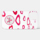 A modern mongram and nametag between red hearts on a phone case. Love is in the air.