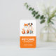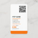 A modern business card design for pet care services. The front of the design shows a vector illustration of a cat and a dog sitting next to each other. It also includes your business name, slogan and the services you offer. On the back you will find a QR code and all your contact details, including your social media handle. The colours used in this design are shades of orange and grey.
