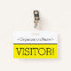 This sleek badge design features the message "VISITOR!", and a customisable company name or other custom message. A badge like this could be used to indicate that a visitor or guest at a workplace is allowed to be there. [~Z0000307]