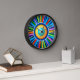 Eye-catching round wall clock featuring an abstract, geometric sunburst of saturated rainbow colours radiating from concentric circles at the centre. Crisp, vector-style stripes in blues, greens, yellows, oranges, reds, and purples contrast with a cool blue background, while slim black hands and a matte black frame keep the look clean and modern. Perfect as a statement piece for living rooms, offices, classrooms, creative studios, or kids’ spaces—adding energy, colour, and contemporary design to any wall.