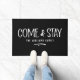 A modern rustic door mat that really makes you feel welcome. A great gift for newlyweds or new homeowners, our custom come and stay doormat in elegant durable black and white features "Come and Stay" in modern, rustic handwritten font. Personalise with your family name in classic white lettering. Designed for you by Blackberry Boulevard.