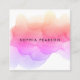 Chic watercolor business cards in a unique square format feature your name or company name layered on a blooming inkblot illustration in colorful shades of pink, violet and golden coral. Add your full contact information to the back in white on black. Includes three social media icons and a template field for your username.