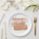 Pretty, modern, minimalist and trendy paper plate design features monochromatic Boho terra cotta watercolor brush stroke graphic.