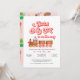 All aboard the gingerbread house train, a sweet baby girl is on the way! This cute baby shower invitation features retro 70s style font in shades of candy pink and gumdrop red. The main feature of this invitation is the hand-painted watercolor Christmas treats featured on the front and back. It is perfect for a Christmas theme baby shower.