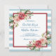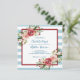 Modern winter wedding invitation design featuring christmas florals on a blue striped background. Backside of the invitation is in a beautiful deep red colour.