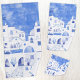 A blue and white watercolor painting of the village of Oia on the Greek island of Santorini.
