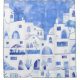 A blue and white watercolor painting of the village of Oia on the Greek island of Santorini.