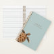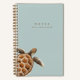 A modern sea themed personalised notebook with a watercolor illustration of a sea turtle on a sea green background. Personalise with your name in brown serif font. Makes a perfect for sea life lovers